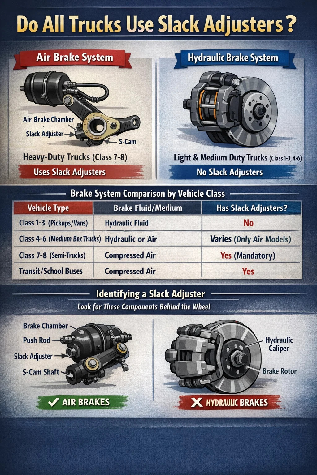 hindi, hindi lahat ng trak ay may mga slack adjuster. Kung ang isang trak ay nilagyan ng mga bahaging ito ay ganap na nakasalalay sa sistema ng pagpepreno nito. Sa partikular, mga mga mga mga slack adjusters ay isang pangunahing bahagi ng mga air brake system na matatagpuan sa mga heavy-duty na komersyal na sasakyan (Class 7 at Class 8 na mga trak). Ang mga light-duty na trak, tulad ng mga karaniwang pickup (Class 1-3), at maraming medium-duty na box truck ay gumagamit ng hydraulic braking system, na hindi gumagamit ng slack adjuster na mekanismo upang mapanatili ang brake shoe o pad clearance.