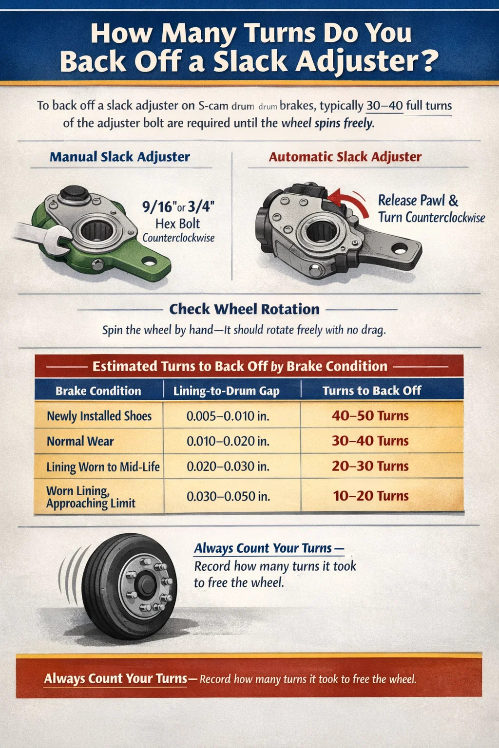 Ang karaniwang pamamaraan para sa pag-back off ng isang slack adjuster ay humigit-kumulang 30 hanggang 40 buong pagliko ng manual adjuster bolt — o hanggang sa ganap na umatras ang brake shoes mula sa drum at malayang umiikot ang gulong nang walang kaladkarin. Para sa mga awtomatikong slack adjuster (ASA), ang proseso ng paglabas ay bahagyang naiiba: tatanggalin mo ang mekanismo ng pawl at manu-manong i-back off ang adjuster hanggang sa ang biyahe ng pushrod ay nasa spec o ang preno ay wala sa drum. Ang eksaktong bilang ng mga pagliko ay nag-iiba depende sa paggawa, modelo, at kasalukuyang estado ng pagsasaayos ng preno, ngunit ang 30–40 na pagliko ay isang maaasahang baseline para sa karamihan ng mga S-cam drum brake system.